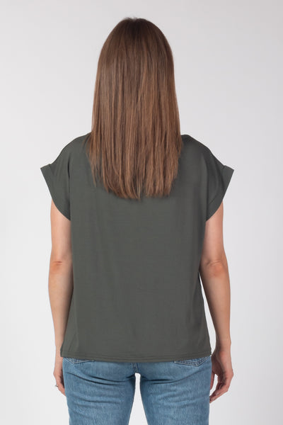 The Phoebe tee is a super soft stretchy fabric which is both comfortable and easy to style. This has a turned up wide sleeve and comes in a few colours, black, navy, grey and olive. These are great to pair up with skirts and dungarees as well as jeans. Dress up or down!